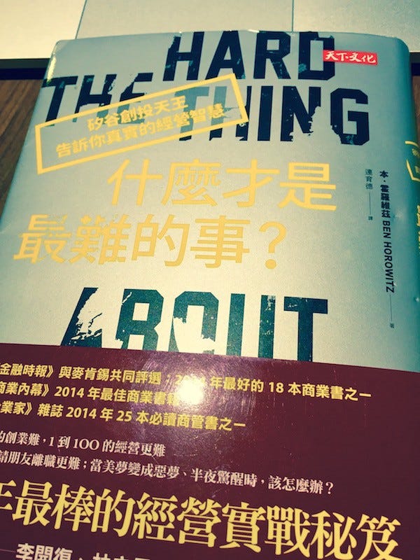 從 2010 開始走向創業的路,直到 2014年受到美國朋友推薦,我讀了【THE HARD THING ABOUT HARD THINGS】英文版,最近重新讀了一次中文版,創業過程當中的點點滴滴歷歷在目,寫下這篇文章的目的,除了提醒我自己,也希望能夠讓更多人從中了解你並不孤獨。